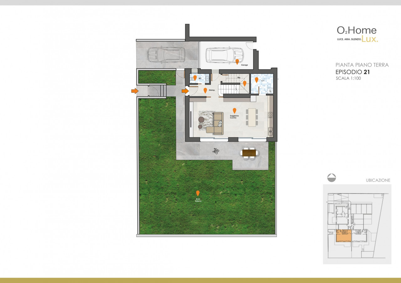 L'unità offre luminosi spazi interni che comprendono una bella zona giorno al piano terra, ben articolata, con affaccio sul patio e giardino, bagno di servizio ed ampio locale tecnico/lavanderia.