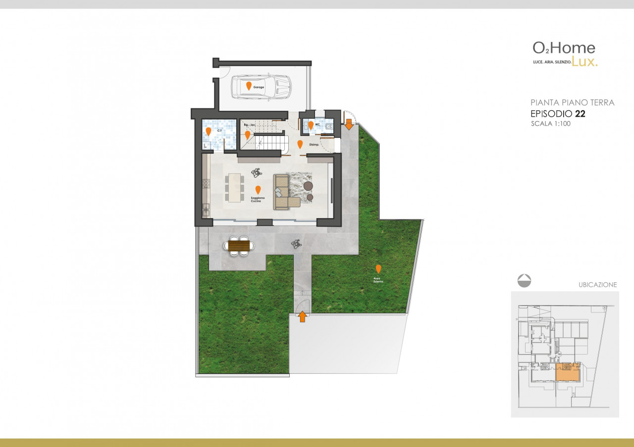 L'unità offre luminosi spazi interni che comprendono una bella zona giorno ben articolata con affaccio sul patio e giardino, bagno di servizio ed ampio locale tecnico/lavanderia.